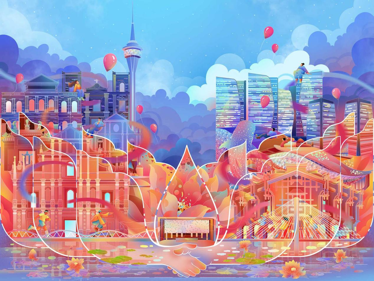 其中,由司徒罗杰创作的插画作品《魅力琴澳》,以其整体性和艺术表现力赢得了评委团的最高评价,成唯一的金奖作品。该作品以澳门区旗上的莲花为核心创意灵感,海面上的莲花托起横琴与澳门两地,横琴口岸如莲茎贯通其间,主体构图精炼,具备高度的符号性与辨识度。